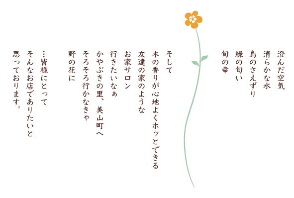 ご遠方のお客様には、季節ごとに足を運んでいただき、近隣のお客様にはカフェで一息、お茶をする感覚で気軽に通っていただける安らぎのサロンとして、ご愛顧いただけると幸いです。